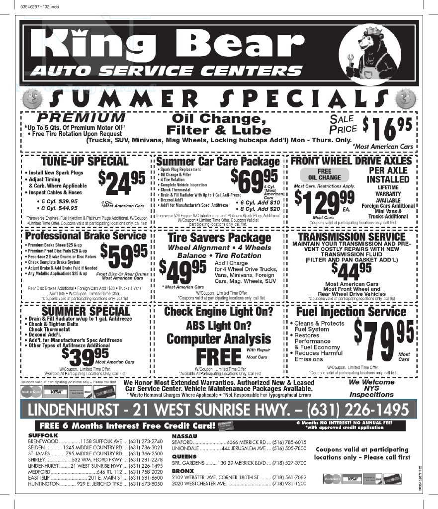 All Coupons and Other monthly Specials listed areValid Only at: 21 West Sunrise Hwy. Lindenhurst 631-226-1495 |